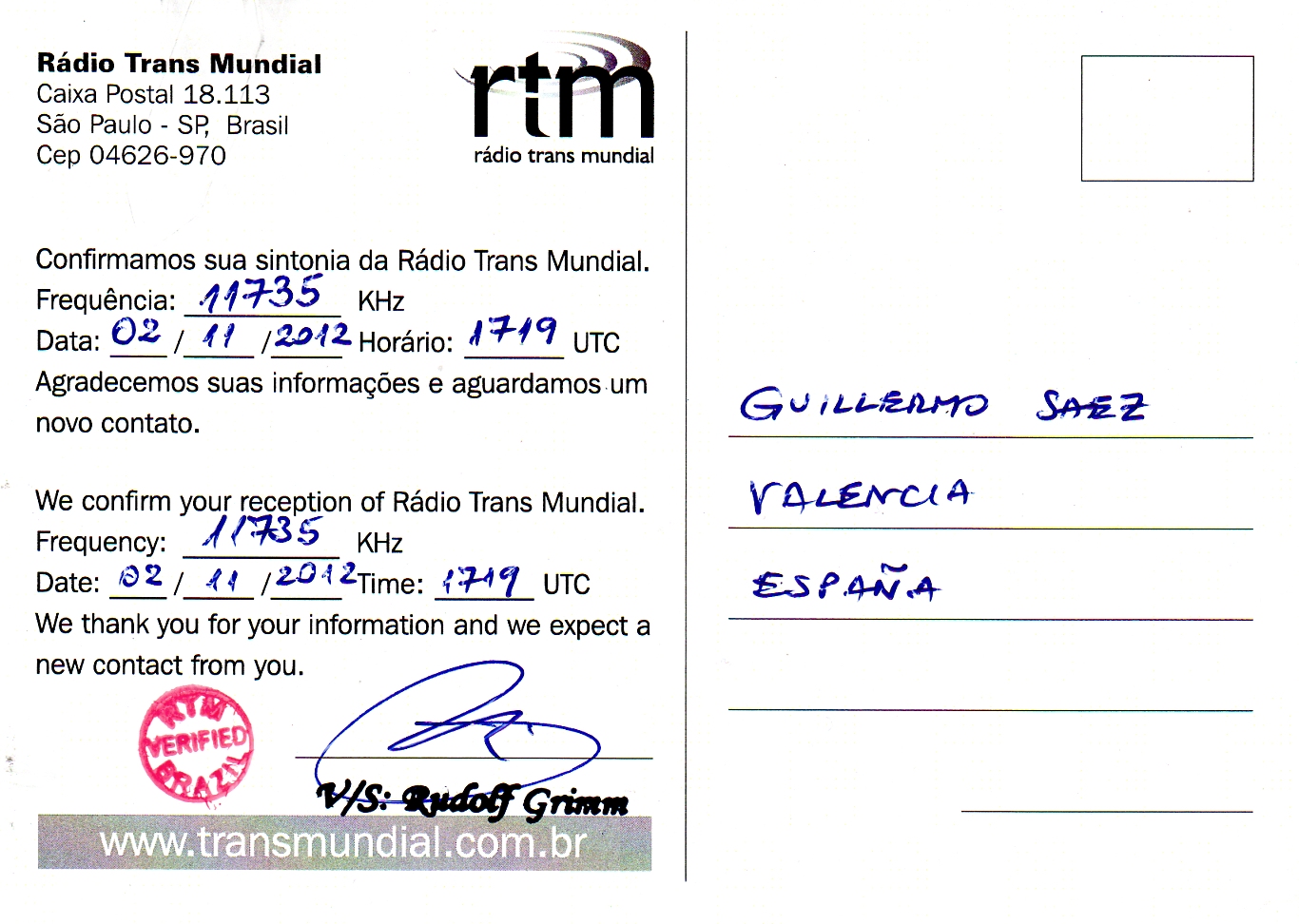 Radio Trans Mundial, via Santa Maria-Camobi, 11735 kHz. Received QSL and brochure in 25 days, sending report to rtm@transmundial.com.br, v/s Rudolf Grimm.